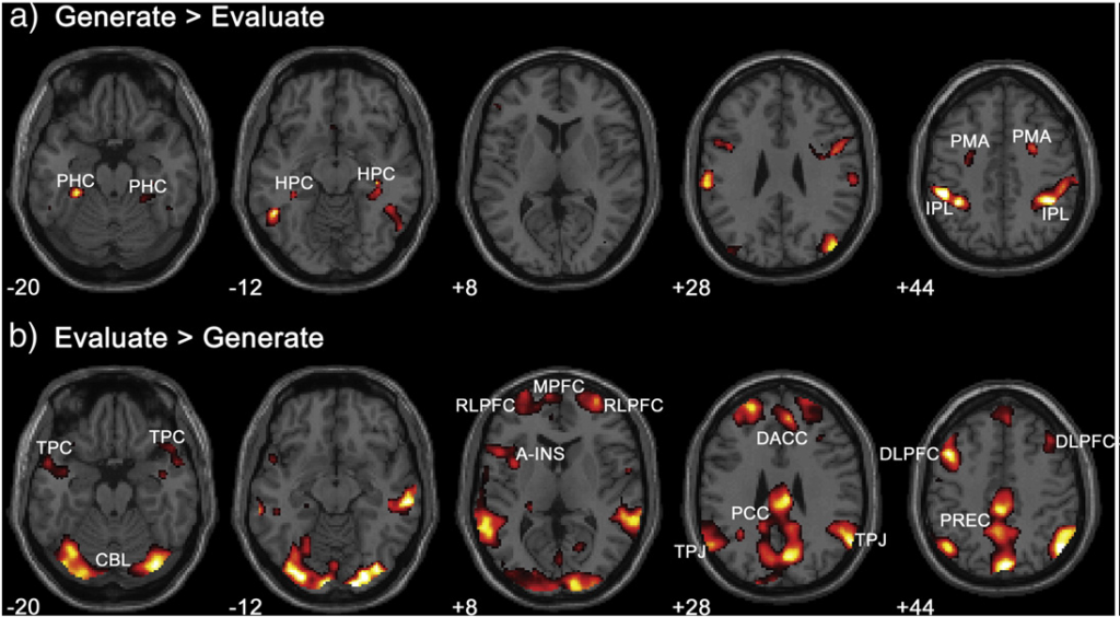 [9] Ellamil, M., et al., (2011). Evaluative and generative modes of thought during the creative process. NeuroImage (2011), volume 59, issue 2.